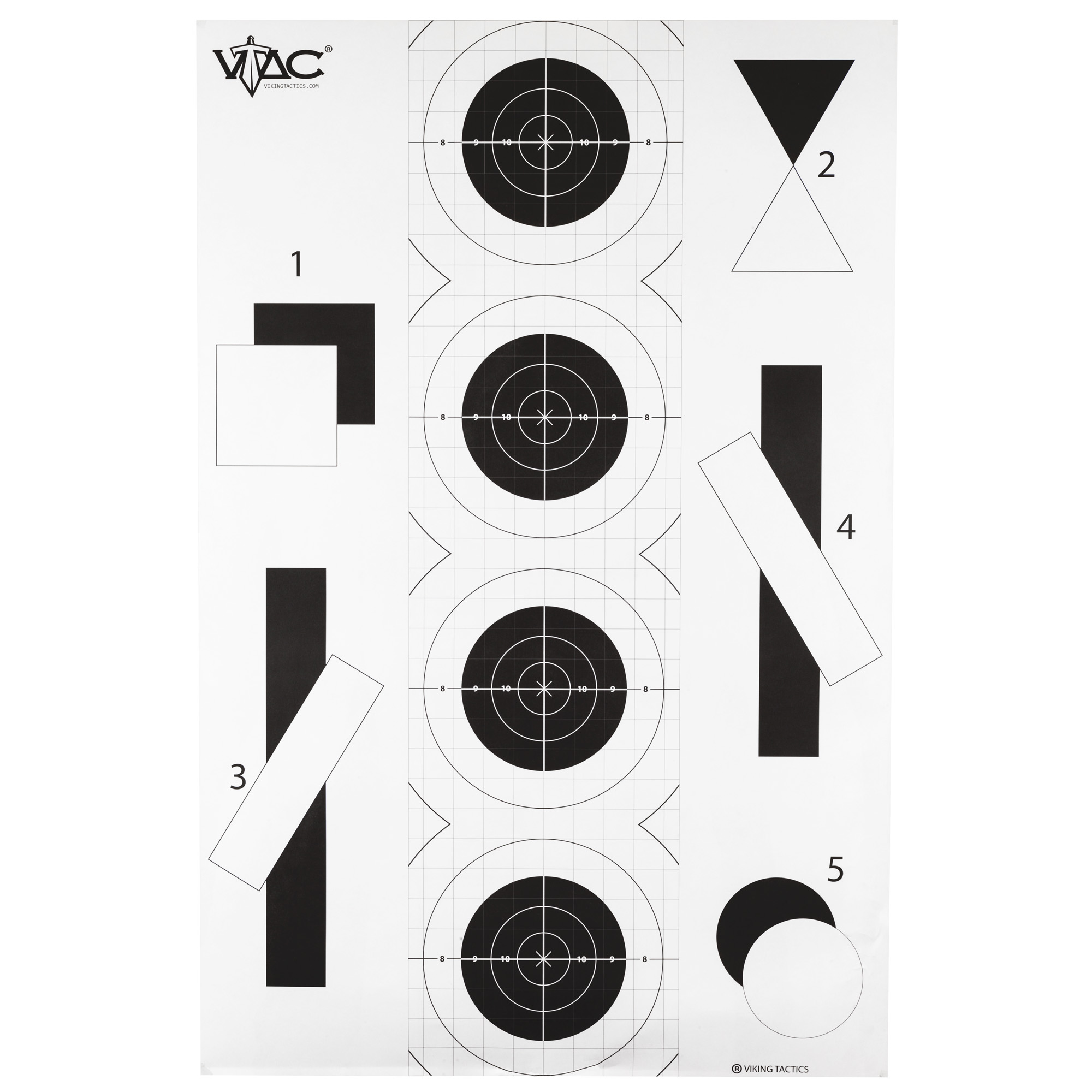 Action Target VTAC-P, Viking Tactics Double Sided Advanced Training Target, Marksmanship Side Has 4 SR-1C Bulls-Eye Target w/1 Square Sighting Grid, Silhouette Side w/Visible Skeleton, Black/White, 23×35, 100 Per Box VTAC-P-100