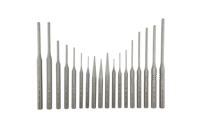 This set contains a full selection of top-quality steel punches for all your gunsmithing needs. The custom walnut bench block is engraved with each punch size to keep your punches organized for quick access.